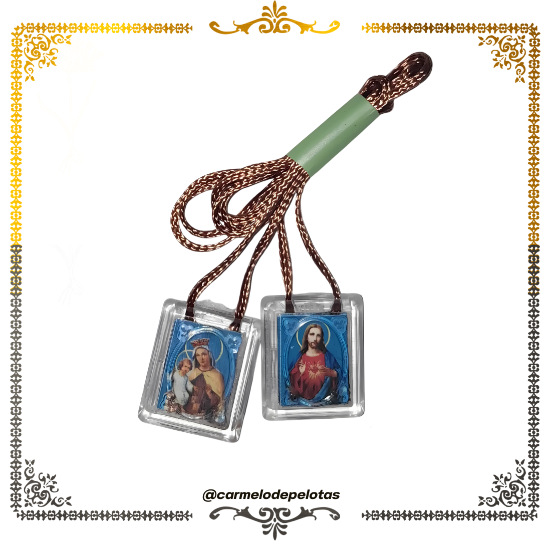Escapulário de Nossa Senhora do Carmo com capinha plástica. O tecido que o faz válido como Escapulário está guardado dentro da mesma capinha. Acompanha oração de bênção e imposição, dentro de um saquinho.